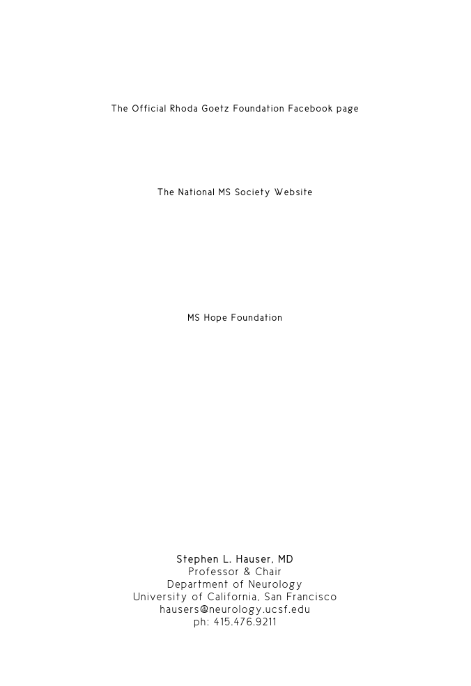 The Rhoda Goetz Foundation Links The Rhoda Goetz Foundation on Facebook The National MS Society Website MS Hope Foundation Stephen L. Hauser, MD Professor & Chair Department of Neurology University of California, San Francisco hausers@neurology.ucsf.edu ph: 415.476.9211